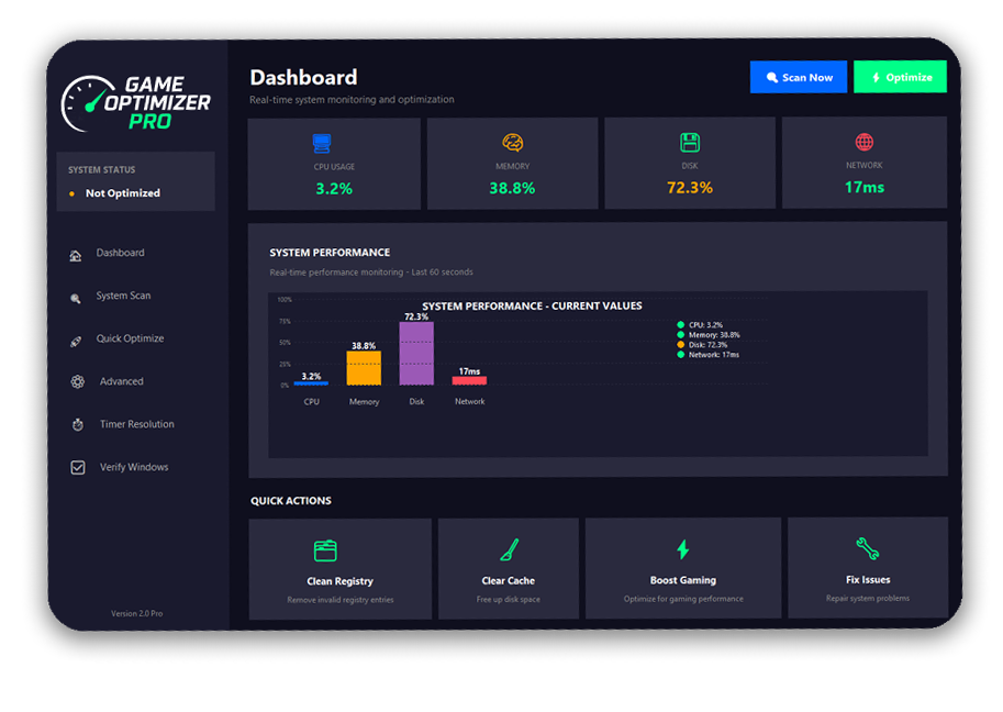 Escanea tu sistema Game Optimizer PRO analiza CPU, memoria, disco y red en segundos.